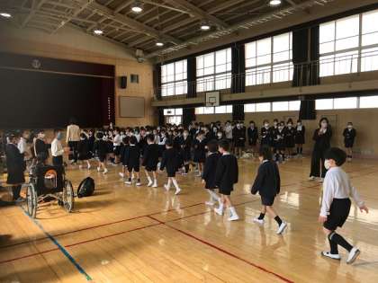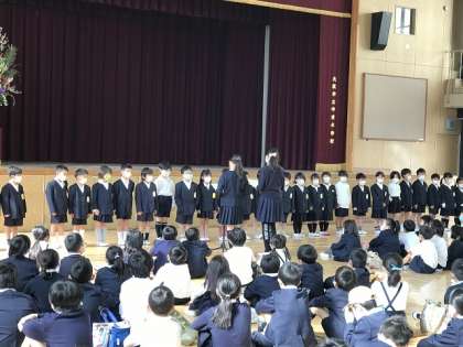 対面式では、1年生が拍手で入場し、在校生代表からのあいさつと1年生からのお礼のことばがありました。登校班やたてわり班など小学校では1年から6年まで一緒に活動する機会がたくさんあります。上級生がうまくリードして、仲良く活動してください。