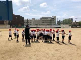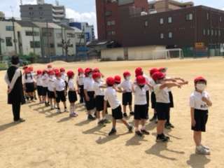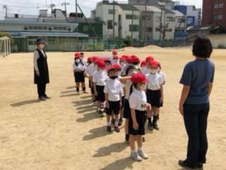 1年生の体育の授業の様子です。真新しい体操服に着替えて整列の練習をしました。