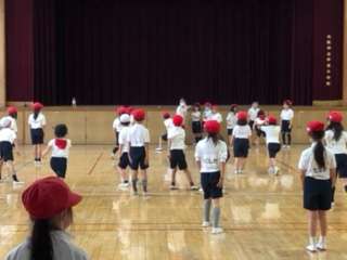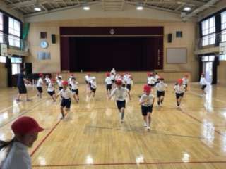 2年生の体育の授業の様子です。講堂でだるまさんがころんだをしていました。講堂をいっぱいに使って楽しく体を動かしていました。