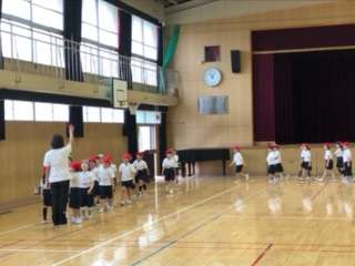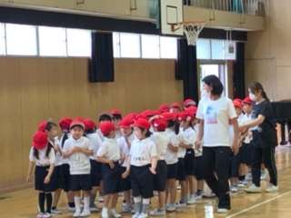 1年生の体育の授業の様子です。講堂で全体行動の練習をしていました。運動会では全体で行動することばかりなので、しっかり覚えましょう。