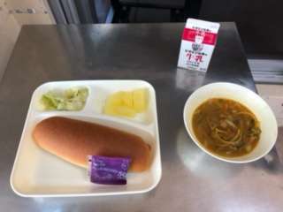 今日のメニューは、カレースープスパゲッティ・キャベツのピクルス・リンゴ(カット缶)・コッペパン・ブルーベリージャム・牛乳です。
