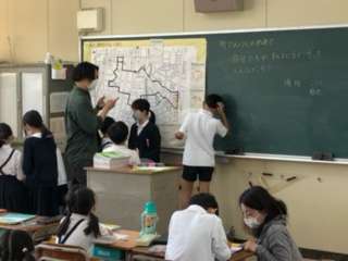 3年生の社会科の授業の様子です。本日、町探検に行ったまとめをしていました。地図に書き込んでいました。地図を見てどのようなルートで探検してきたかわかりますか?