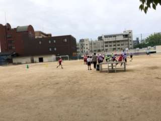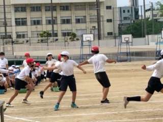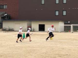 5年生の体育の授業の様子です。リレーをしていました。毎日見ていると日に日に上達しているのが分かります。運動会まであと1か月です。がんばりましょう。
