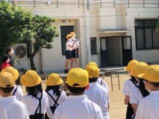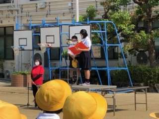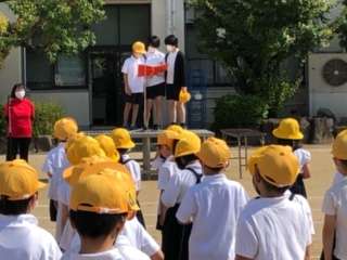 運動場で全校朝会を行いました。校長先生のお話の後、看護当番から先週の反省と今週の目標についての話がありました。