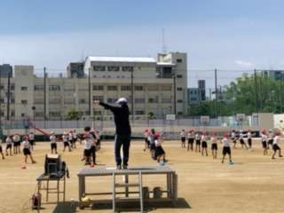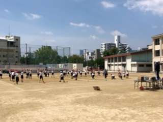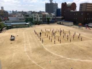 3・4年生の体育の授業の様子です。団体演技の練習の様子です。鳴子を使って踊ります。運動場に心地よい音が響いていました。