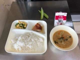 今日の献立は、赤魚のしょうゆだれかけ・みそ汁・えんどうの卵とじ・ごはん・牛乳です。