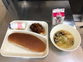 今日のメニューは、じゃがいものミートグラタン・スープ・発酵乳・黒糖パン・牛乳です。
