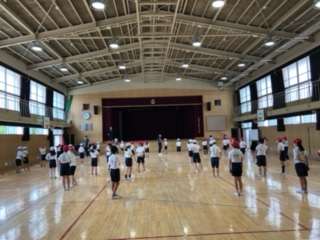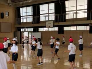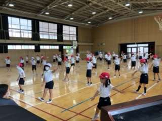 3・4年生の体育の授業の様子です。講堂で団体演技の練習をしていました。今日は全体を通しての練習でした。暑い中、ここまで本当によくがんばりました。