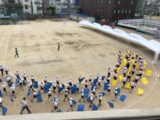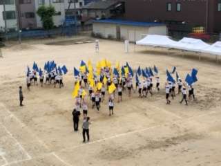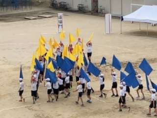 5・6年生の体育の授業の様子です。団体演技の練習の様子です。旗をもって行進しています。うまく交差もできました。堂々とした行進はとても立派でした。