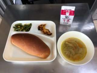今日のメニューは、鶏肉のカレーマヨネーズ焼き・てぼ豆のスープ・さんど豆とコーンのサラダ・黒糖パン・牛乳です。