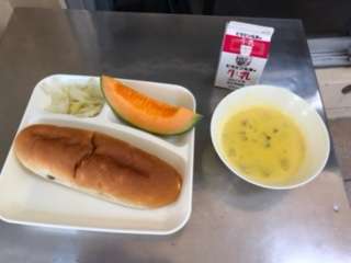 今日のメニューは、かぼちゃのクリームシチュー・キャベツのゆずドレッシング・クインシーメロン・おさつパン・牛乳です。
