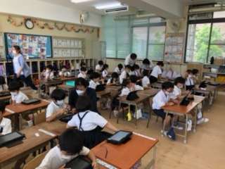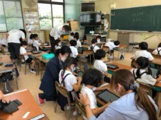 1年生の情報教育の授業の様子です。タブレット端末の使い方の学習をしていました。ICTの支援員さんもていねいに対応してくださっています。