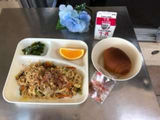 今日のメニューは、和風焼きそば・オクラの甘酢和え・オレンジ・黒糖パン・牛乳です。