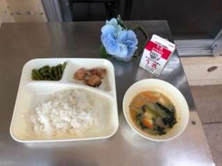 今日の献立は、鶏肉のしょうゆバター焼き・豆腐のみそ汁・さんど豆のごま和え・ごはん・牛乳です。