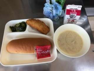今日のメニューは、サーモンフライ・豆乳スープ・きゅうりのバジル風サラダ・コッペパン・イチゴジャム・牛乳です。