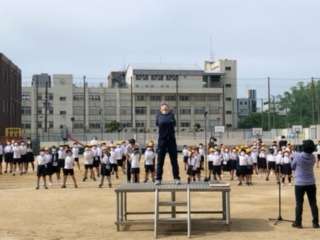 運動場で全校朝会を行いました。朝会に先立って、健康委員会からよい姿勢を保つストレッチを行いました。ストレッチはこれから毎週行います。