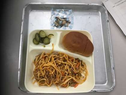 今日のメニューは、スパゲッティミートソース、きゅうりのピクルス、アーモンドフィッシュ、黒糖パン、牛乳です。