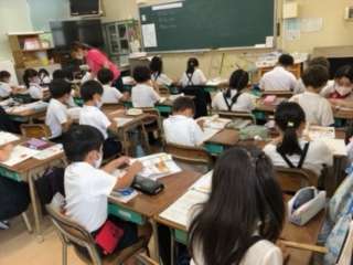 2年生の算数科の授業の様子で30cmの物差しを使って長さを測っていました。興味のある物の長さを調べるといいですね。家でも調べてみましょう。