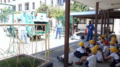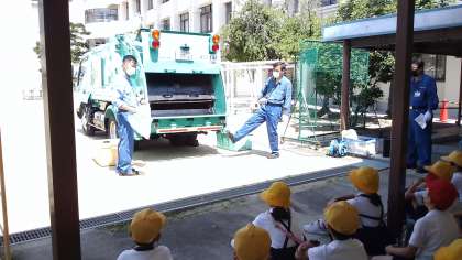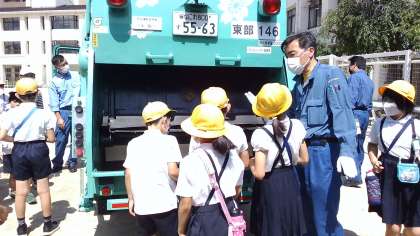 環境事業局の方に来ていただいて、パッカード車を見学し、ごみの分別処理など環境についての学習をしました。
