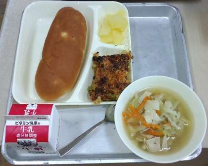 カレードリア、豚肉とキャベツのスープ、りんご(カット缶)