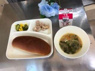 今日のメニューは、鶏肉のから揚げ・中華みそスープ・きゅうりとコーンの甘酢和え・黒糖パン・牛乳です。