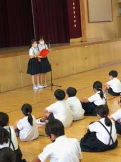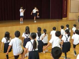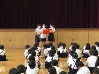 講堂で全校朝会を行いました。健康委員会から姿勢ストレッチを行った後、校長先生のお話に続いて、看護当番から先週の反省と今週の目標についての話がありました。