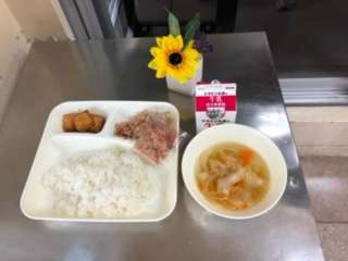 今日の献立は、豚肉ともやしの炒め物・すまし汁・厚揚げのしょうがじょうゆかけ・ごはん・牛乳です。