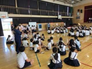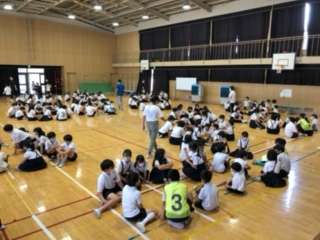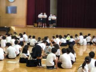 講堂で児童集会を行いました。今日は、言葉当てクイズでした。司会が、ハモッていう言葉を当てます。