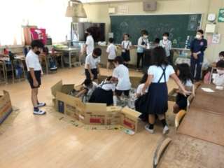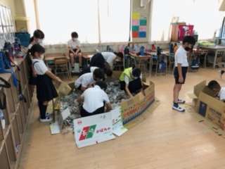 宝探しの様子です。新聞の中にコインが隠れています。点数の高いコインを目指して、よーいどんで飛び込んでいました。
