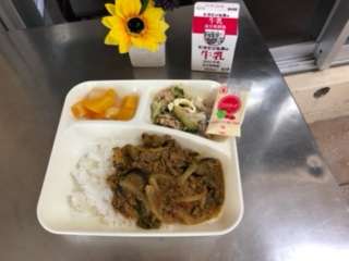 今日の献立は、夏野菜のキーマカレーライス・ゴーヤとツナのマヨネーズ風味・ミックスフルーツ(缶)・牛乳です。