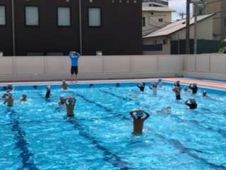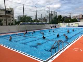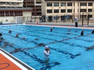 3年生の体育の授業の様子です。プールで水慣れの運動をしていました。プールの底で正座をしたり、横になったりしていました。水の中で顔をつけて息を吐くことができれば、泳げるようになっていきます。がんばりましょう。