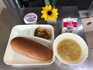 今日のメニューは、かぼちゃのミートグラタン・スープ・ぶどうゼリー・黒糖パン・牛乳です。
