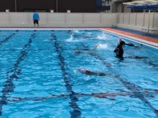 3年生のプール学習の様子です。けのび・バタ足の練習をしていました。頭を中に入れて、ピンと背中を伸ばしてしっかり壁を蹴るとスムーズに進みます。これをマスターすることが上達への近道です。繰り返して練習しましょう。