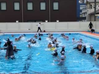 1・2年生の水遊びの様子です。曲に合わせて水慣れの運動をしていました。日差しがなかったのですが、ちょうどよい気温でみんな笑顔でがんばっていました。