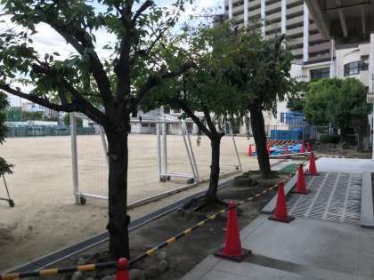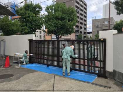 玉津中学校、東小橋小学校の管理作業員さんに来ていただいて、給食室搬入門の塗装や通路横の樹木の枝の伐採をしていただきました。