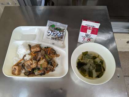今日の献立は、マーボ厚揚げ丼・中華スープ・ミニフィッシュ・牛乳です。