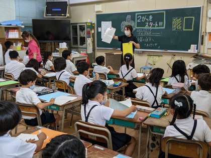 2年生の学級活動の授業の様子です。黒板には「2がっき スタート!!!」と書かれています。子ども達は、夏休みの宿題を台紙に張っていました。どんなことが書いてあるのか気になりますね!