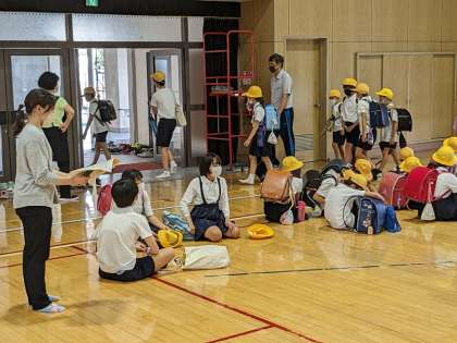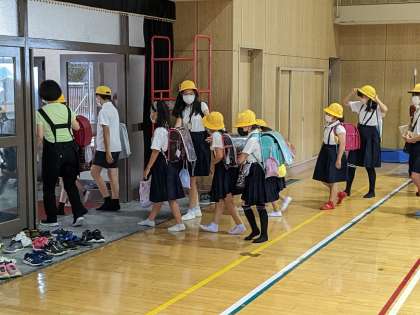 台風接近による暴風警報発令を想定しての避難訓練を行いました。全員が講堂に集まり集団下校をしました。