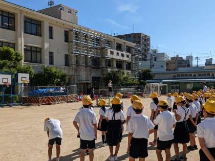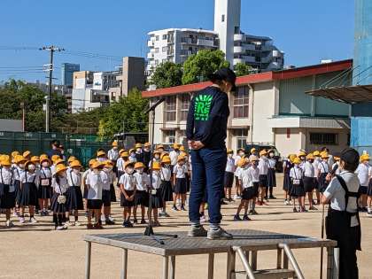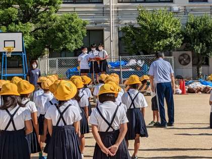 秋を感じさせる風の吹く中、全校朝会を行いました。姿勢体操を行った後に、校長先生から工事についてのお話がありました。続いて、看護当番から今月・今週の目標についての話がありました。最後に図書委員会から本の貸し出しについてのお知らせがありました。