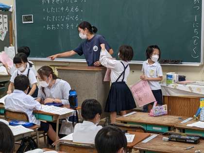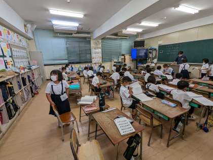 残念ながら降雨でプール学習が中止になりました。教室で夏休みの宿題の間違い直しをしていました。終わったこは、タブレット端末を使って学習していました。