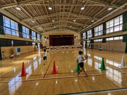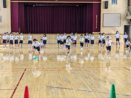 体育の授業の様子です。講堂でボールを使ってリレーをしていました。みんな笑顔で楽しくがんばっていました。