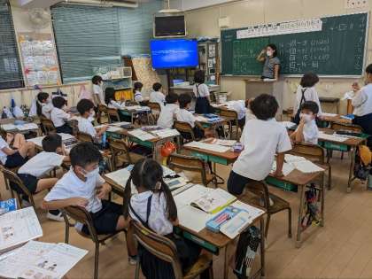 算数科の授業の様子です。かずのせんの学習をしていました。大きな数直線を使って数を確認しながら学習を進めていました。わかった答えを大きな発表していました。