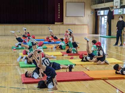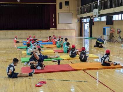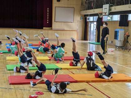 講堂での体育の授業の様子です。マット運動をしていました。先生の細かい指示を聞いて後ろ周りの練習していました。うまくできるようになるといいですね。