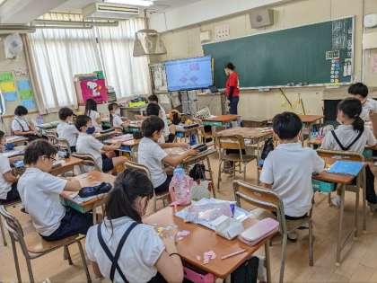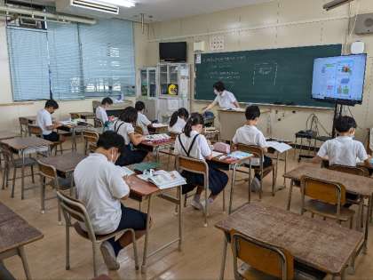 算数科の授業の様子です。少人数2分割で授業を受けていました。身の回りの四角形を探す授業でした。台形や平行四辺形も探していました。家庭にもたくさんの四角形があると思います。探してみるのも楽しいですね。