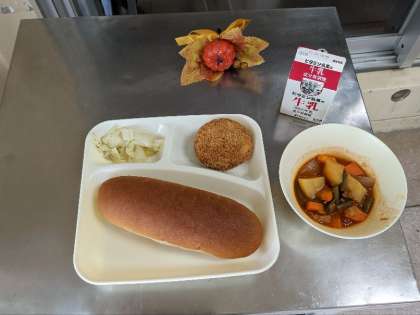 今日の献立は、チキンレバーカツ・ケッチャプ煮・キャベツのバジル風味サラダ・黒糖パン・牛乳です。