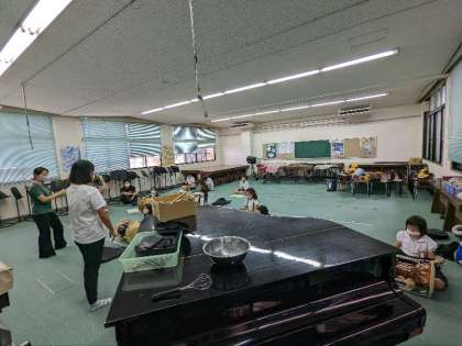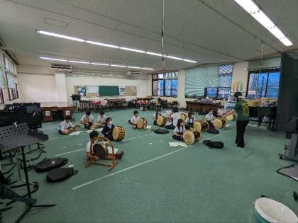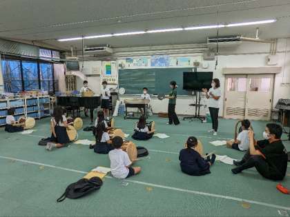 音楽室で民族クラブの活動を行いました。音楽室で発表会の練習をしました。みんなががんばったので、息の合った演奏ができました。これで半分が完成しました。全部の演奏ができるまで、これからもがんばりましょう。