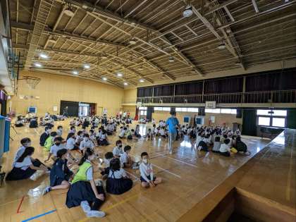 集会の終わりに、今日が最終日の教育実習の先生からお別れの挨拶がありました。