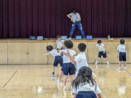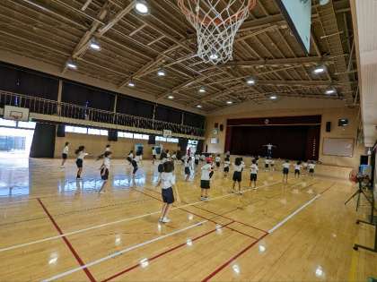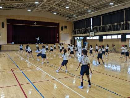 体育の授業の様子です。講堂でリズムに合わせていろいろな動きを取り入れられた体操をしていました。全身運動になります。1度踊ると汗をかきます。