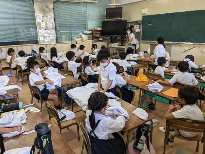 生活科の授業の様子です。使ったエプロンをきれいにたたんで袋に入れる練習をしていました。今日持ち帰りますのできれいにたためているか見てください。たためていたらほめてあげてください。