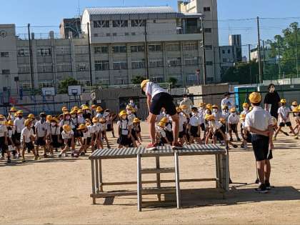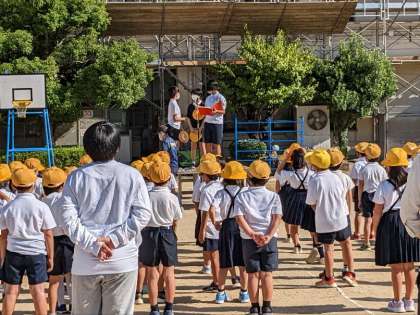 秋晴れの日差しの強い中、運動場で全校朝会を行いました。健康委員会の朝のストレッチを行いました。校長先生のお話の後、看護当番から先週の反省と今週の目標についての話がありました。